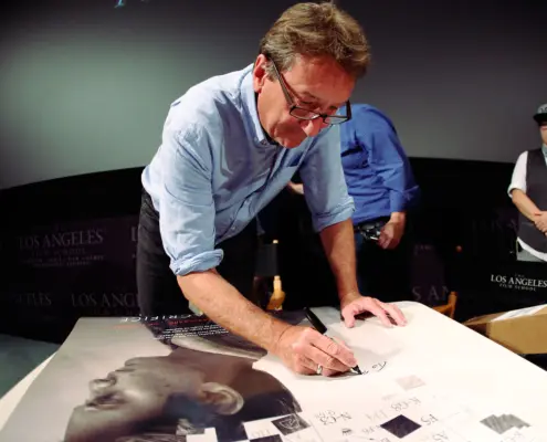 Steven Knight signs a Pawn Sacrifice Movie Poster at The Los Angeles Film School