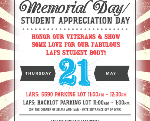 You're invited to join our Memorial Day Student Celebration Day Honor our Veterans & Show some love for our fabulous LAFS Student Body!