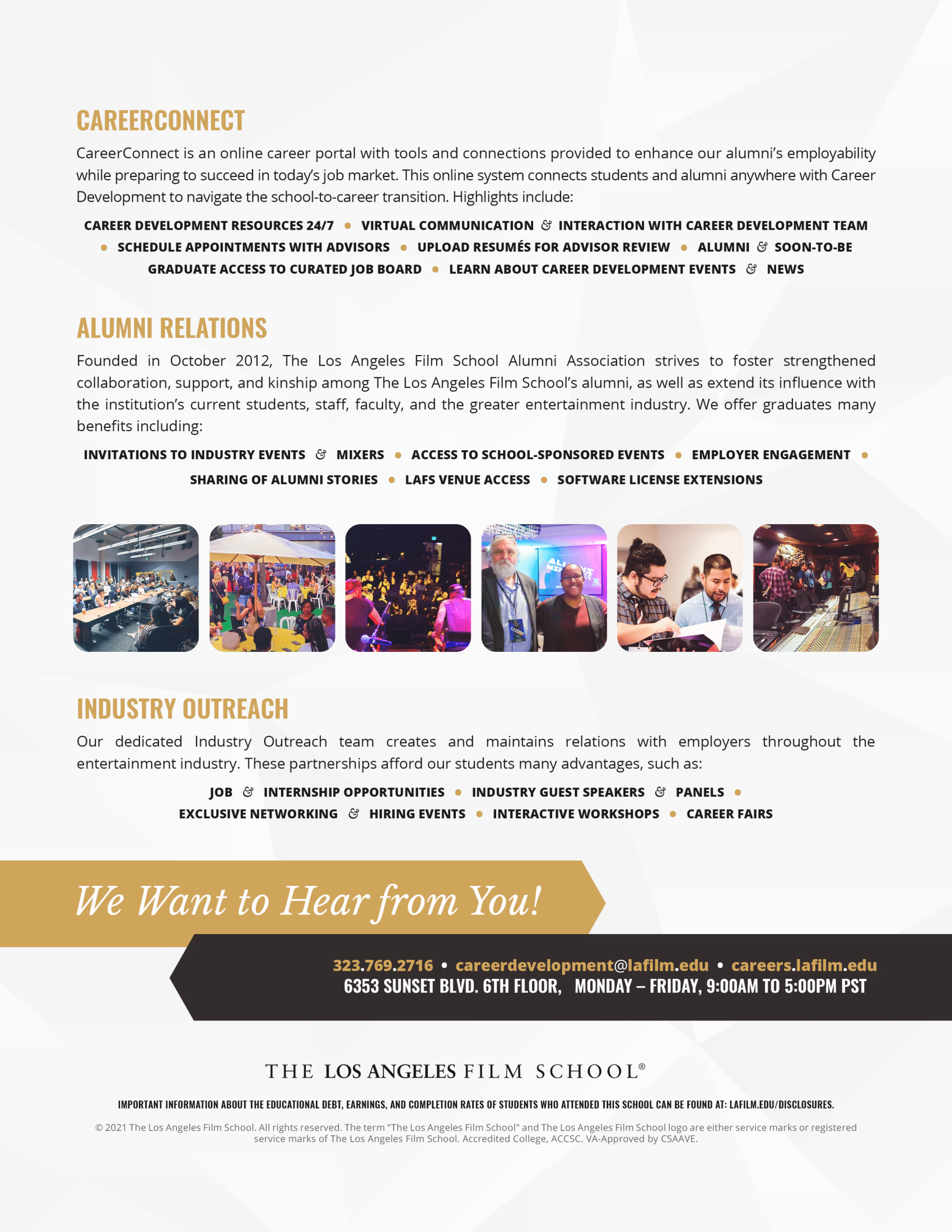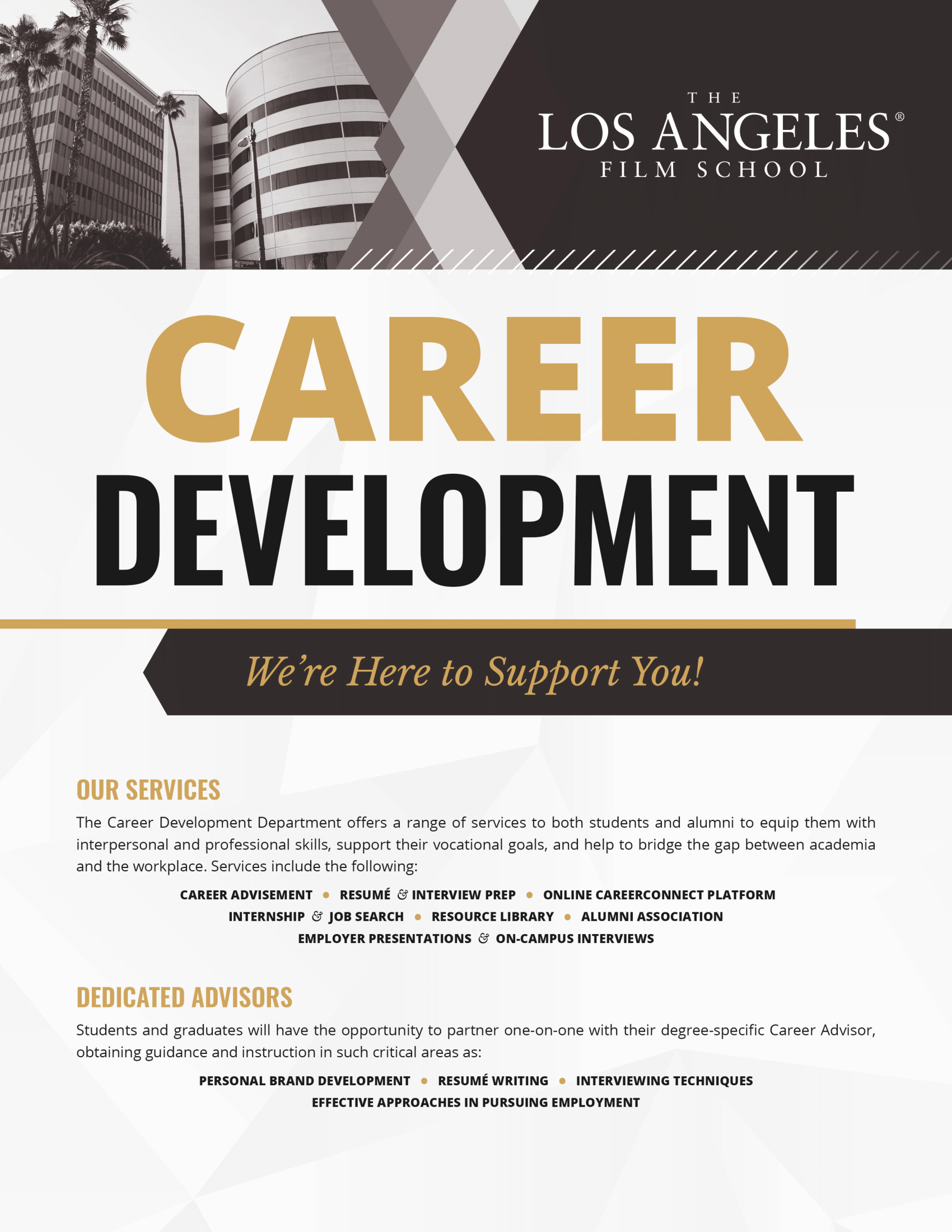 Career Development’s mission is to provide the assistance and resources that will support students and graduates as they navigate the challenging path to creating and sustaining a successful career. The keys to unlocking and managing a successful career in the entertainment industry are research, networking, preparation, professionalism, and the ability to stay current with industry practices and trends. The Career Development Department works in conjunction with students’ education curricula to prepare them with interpersonal and professional skills, support their vocational goals and help to bridge the gap between academia and the workplace.