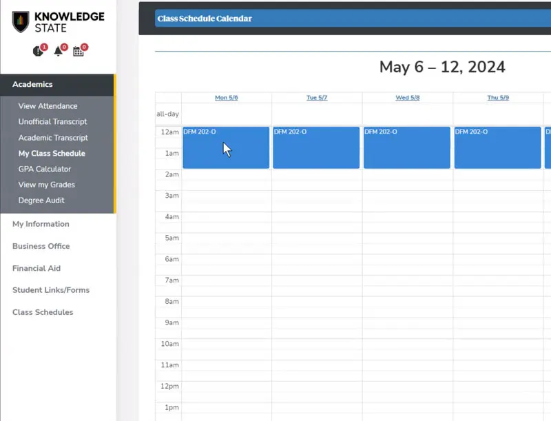 • Upcoming Classes: View your complete class schedule with details like times, instructors, and classroom locations.